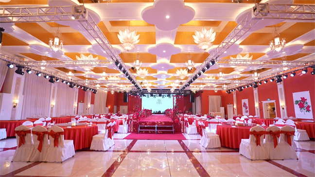喜事匯酒店,五號宴會廳-水晶廳以"星辰夢境"為設計靈感,將現(xiàn)代藝術與自然美學結合。全廳采用無柱式設計,通透空間可容納29桌賓客。頂部懸掛璀璨燈飾,光影流轉間如銀河傾瀉,搭配流線型裝飾墻,營造出360°沉浸式光影體驗,讓每個瞬間都閃耀非凡。該宴會廳自帶高雅精致的場景布置,從燈光到裝飾皆經(jīng)過設計,無需額外聘請婚慶公司進行場布,即可呈現(xiàn)如夢似幻的浪漫氛圍,讓新人省心省力,享受美麗婚禮。